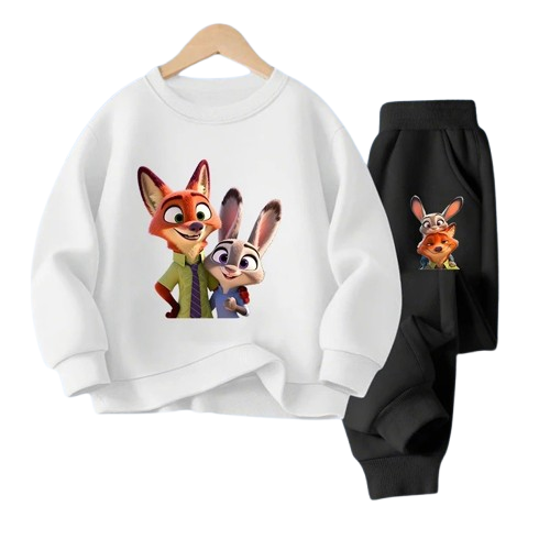 Postaw na wygodę i radosny styl swojego dziecka. Ten dwuczęściowy komplet dresowy to idealny wybór na codzienne przygody w przedszkolu, szkole czy na placu zabaw. Zestaw składa się z bluzy z kolorową grafiką sympatycznego lisa i króliczka oraz spodni dresowych.