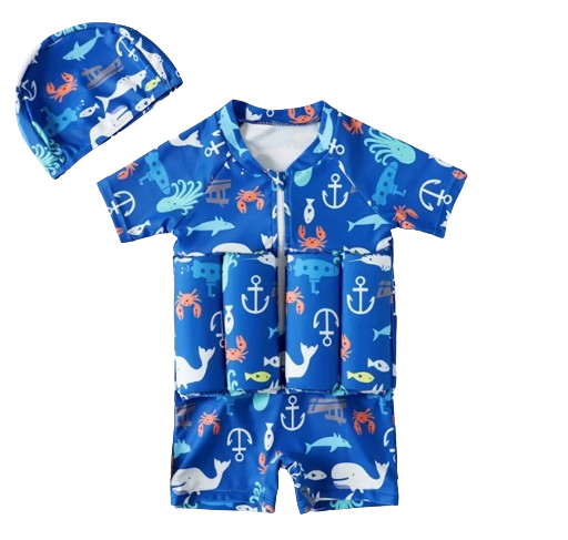 Niebieski jednoczęściowy strój kąpielowy dla dzieci zdobiony motywem rybek. Wygodny i modny, idealny na plażę czy basen. Dziecko będzie się w nim świetnie czuło oraz zwróci uwagę wszystkich swoim stylowym wyglądem. Idealny wybór na letnie dni!
