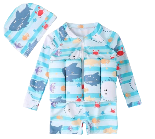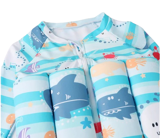 Niebieski jednoczęściowy strój kąpielowy dla dzieci zdobiony motywem rekina. Wygodny i modny, idealny na plażę czy basen. Dziecko będzie się w nim świetnie czuło oraz zwróci uwagę wszystkich swoim stylowym wyglądem. Idealny wybór na letnie dni!
