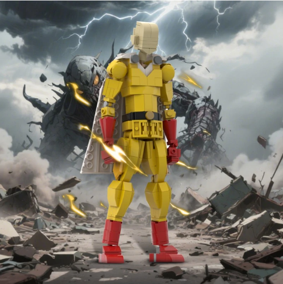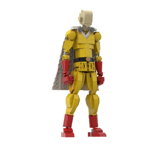 Model przedstawia Saitamę w żółtym stroju z peleryną, czerwonymi rękawicami i butami. Dzięki solidnej konstrukcji z wysokiej jakości klocków ABS oraz dokładnemu odwzorowaniu detali, figurka świetnie nadaje się do ekspozycji na półce lub biurku.