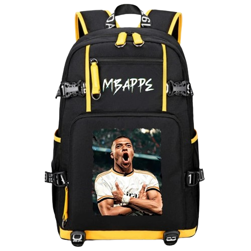 Czarny plecak dla chłopca do szkoły z delikatnymi żółtymi zdobieniami i nadrukiem Mbappé to idealny wybór dla małego fana piłki nożnej. Stylowy, pojemny i wygodny, wyposażony w wygodne szelki oraz dodatkowe kieszenie, pomieści wszystkie niezbędne przybory szkolne. Idealny do codziennego użycia!