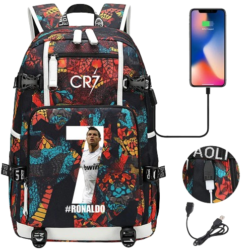 Plecak dla chłopca do szkoły w kolorze czerwonym z nadrukiem piłkarzy i wejściem USB do ładowania telefonu