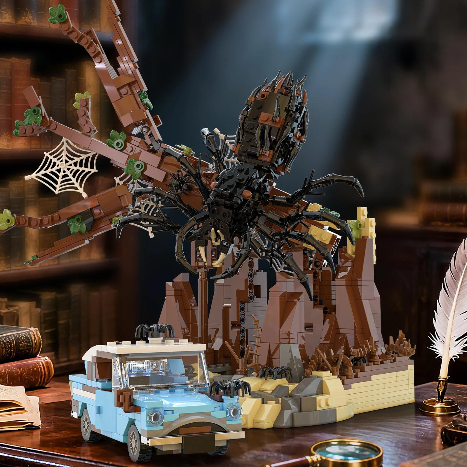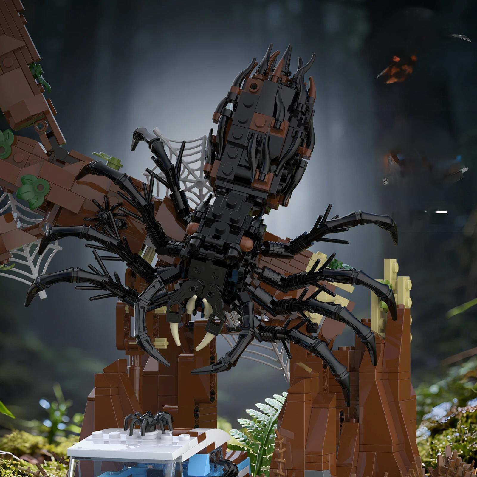 Efektowny zestaw klocków typu diorama, przedstawiający gigantycznego pająka ukrytego w mrocznym, magicznym lesie, z rozbudowaną scenografią oraz pojazdem terenowym. Model inspirowany jest klimatem świata fantasy i tajemniczych leśnych opowieści, oferując dynamiczną, pełną detali konstrukcję.